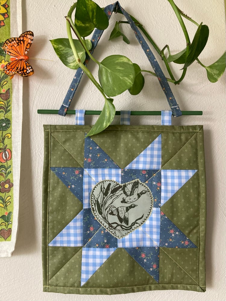 fully handmade quilted wall hanging. the center design is my original hand printed artwork