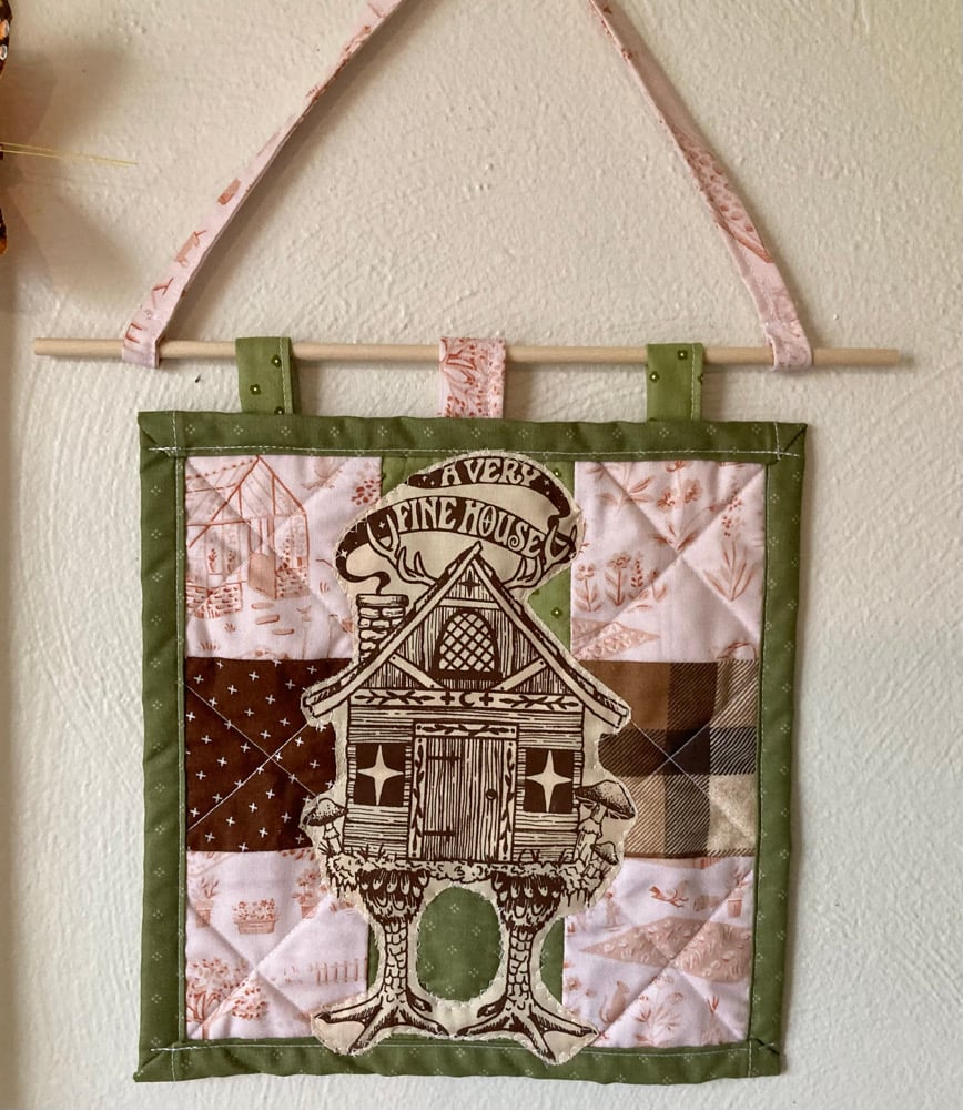 fully handmade quilted wall hanging. the center design is my original hand printed artwork