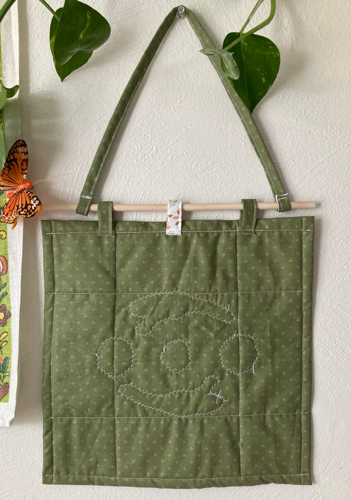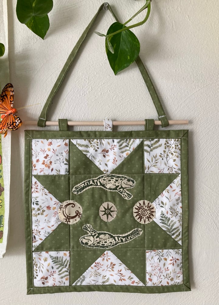 fully handmade quilted wall hanging. the center design is my original hand printed artwork