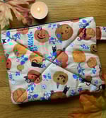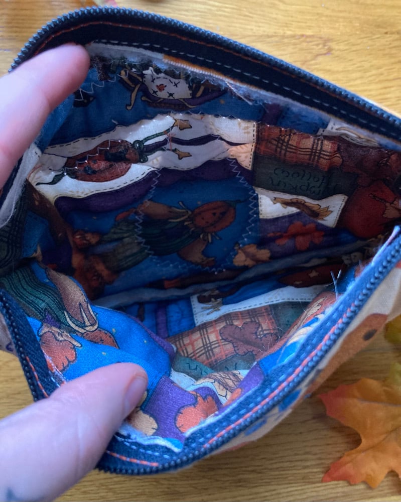 this pouch is made from the cutest pumpkin and black cat fabric and a white fabric with bats! all 100% cotton.